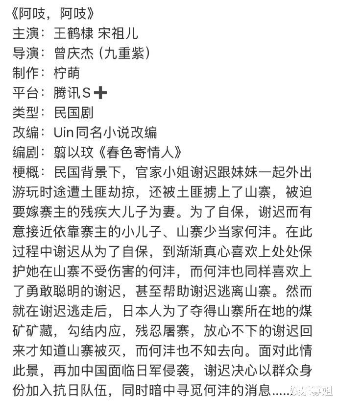 据悉,《阿吱阿吱》改编自Uin同名小说,由曾庆杰执导,翦以玟编剧(《春色寄情人》),讲述了官家千金谢迟被山贼掳上山寨,被迫嫁给寨主的残疾长子,为求自保接近少当家何沣,两人从彼此试探到真心相许。日军血洗山寨后,二人失散,各自投身抗日队伍。