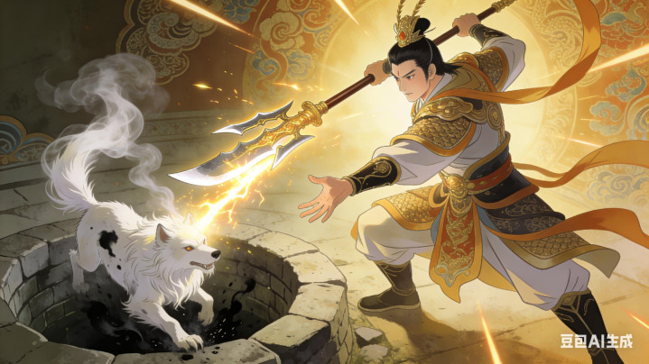 杨戬挥出三尖两刃刀,一道金光劈入井底。怨气消散,白毛狗化作一道白烟,随杨戬腾空而去。