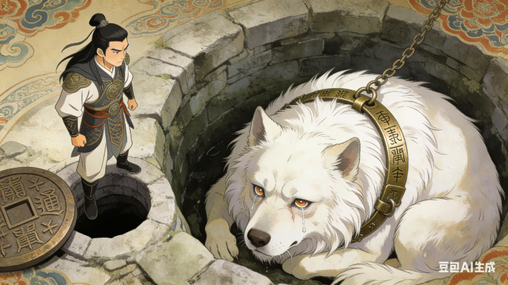 杨戬一掌震开井盖,只见井底蜷着一只浑身白毛的大狗,双眼含泪,颈上锁着刻满符文的铜环。
